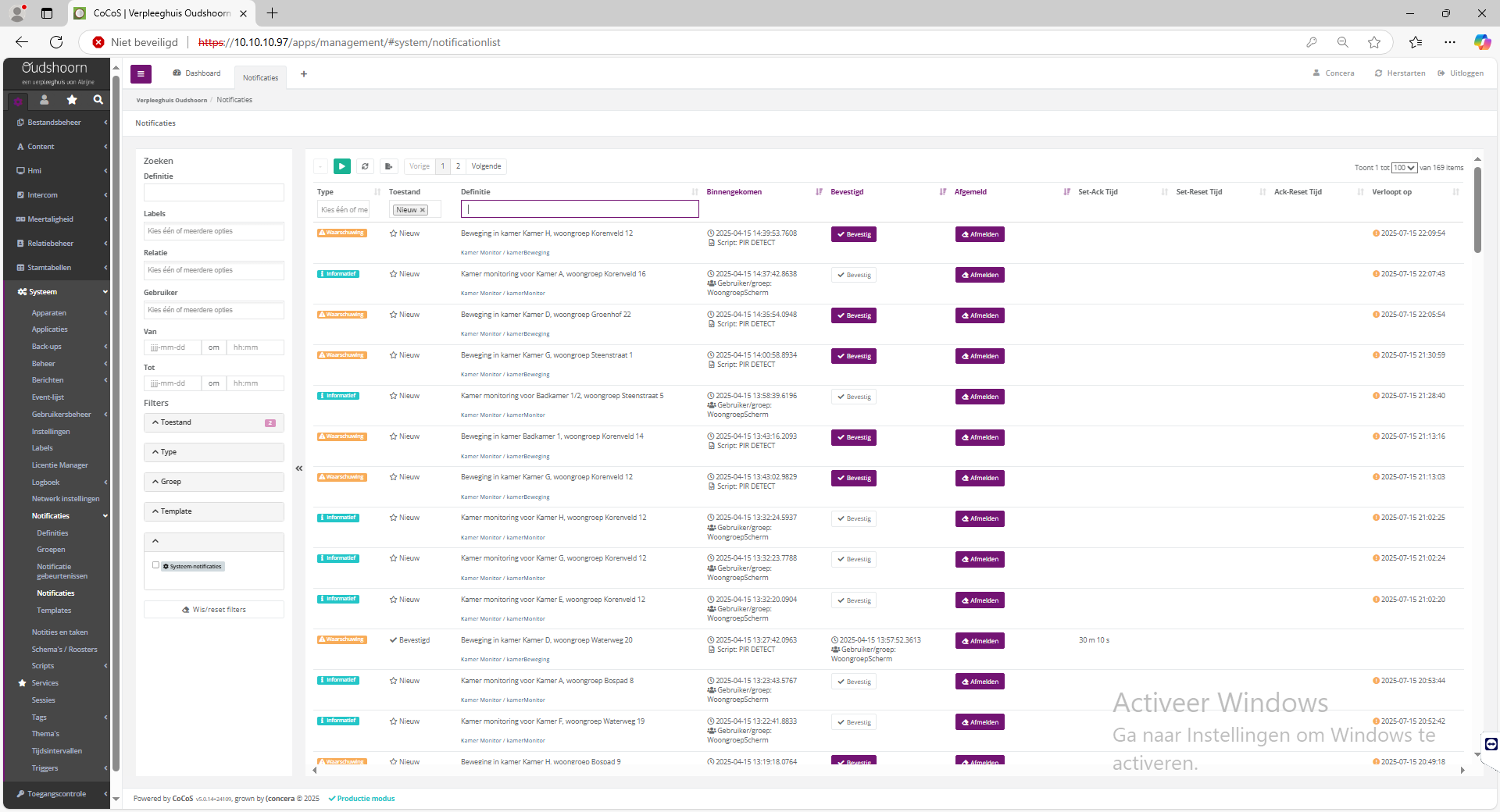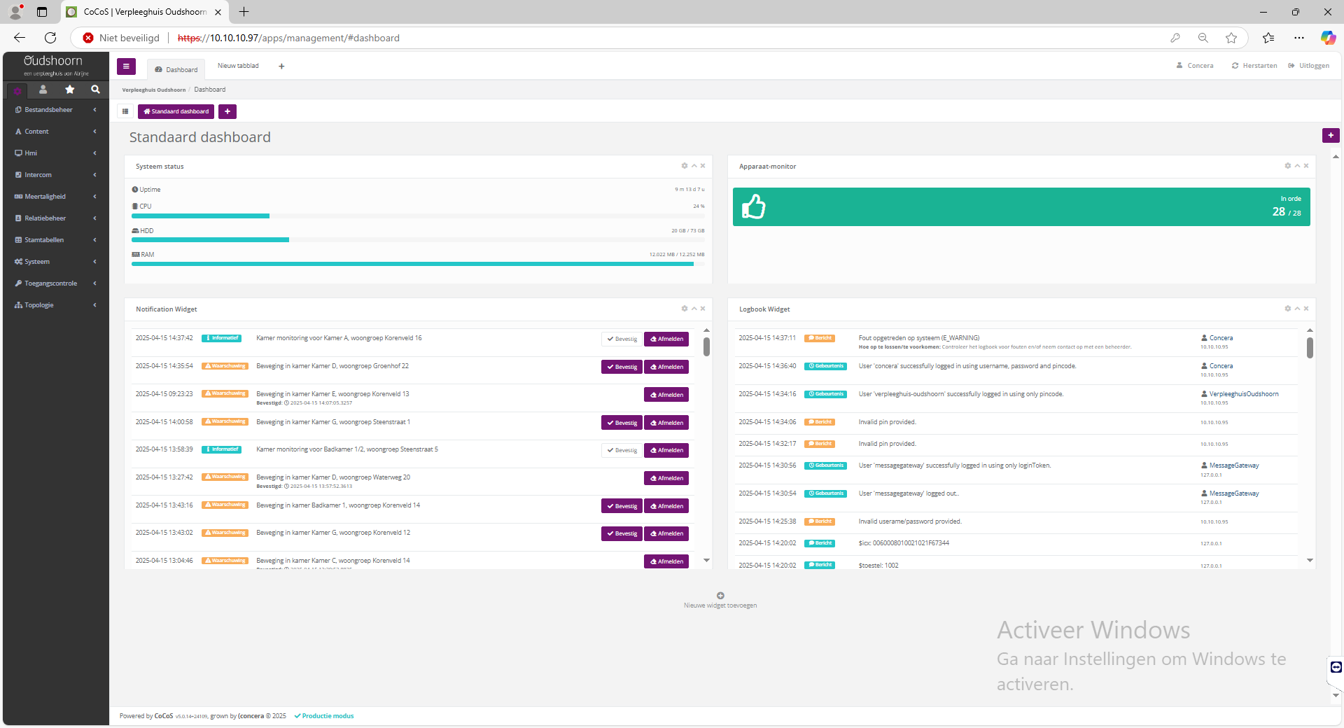 - Applicatie op de woongroepen voor het inzien van de kamerstatussen, aan-/uitschakelen van monitoring en afmelden van detectie.